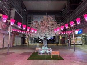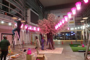 ベイズなら、季節も環境も選ばずに、大きな桜を咲かせることが出来ます! ご依頼いただければ、春夏秋冬一年中いつでも納品可能です。 足場や重機も使わずに、脚立のみで施工可能。 館内外問わず、あらゆる環境に設置可能です。